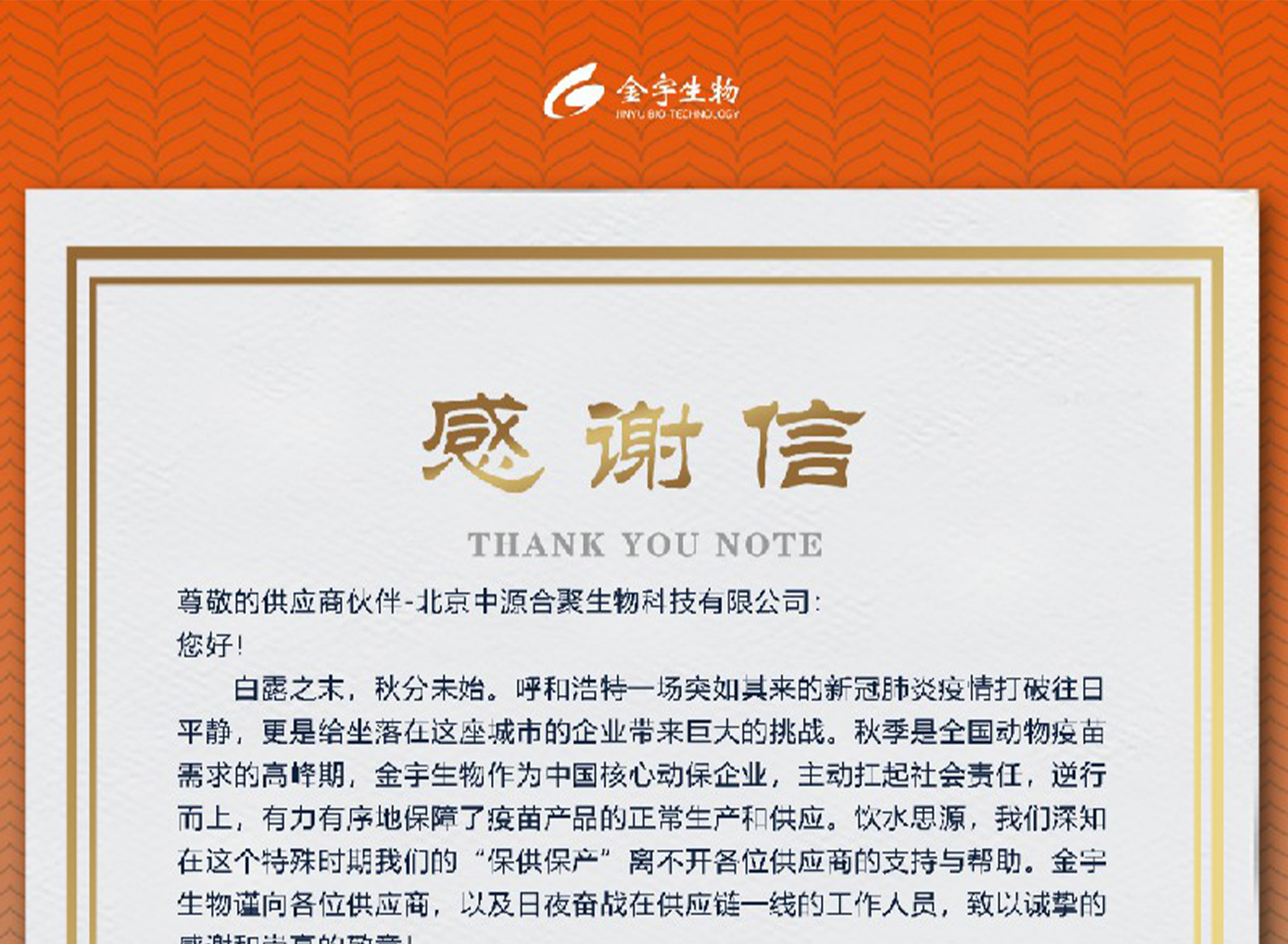 近日,金宇生物技术股份有限公司(以下简称“金宇生物”)发来感谢信,对我司在呼和浩特疫情突发期间为疫苗产品“保供保产”做出的贡献表示衷心的感谢。2022-12-08 14:05:00.0