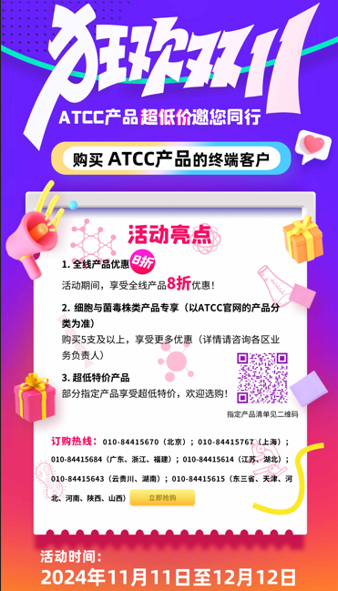 双11盛惠,ATCC产品超低价邀您同行! 活动时间:2024年11月11日至12月12日,且2025-03-31前完成交货 2024-11-08 14:42:00.0