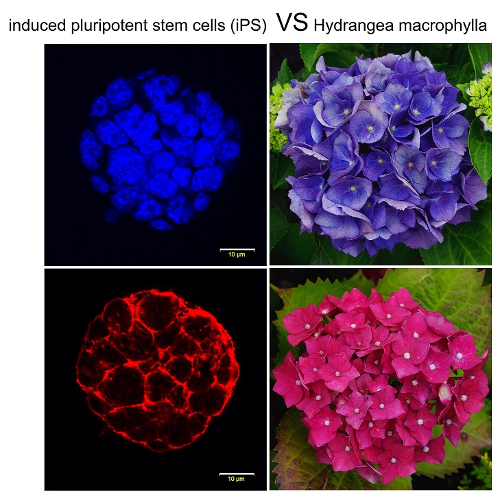 “异曲同工:从细胞水平诱导多能干细胞(ipsc)到个体水平八仙花,生命的巧合让我们叹为观止!左:ips克隆hoechst,SSEA1染色,Olympus FV10i,右:八仙花 PENTAX K-r 。”