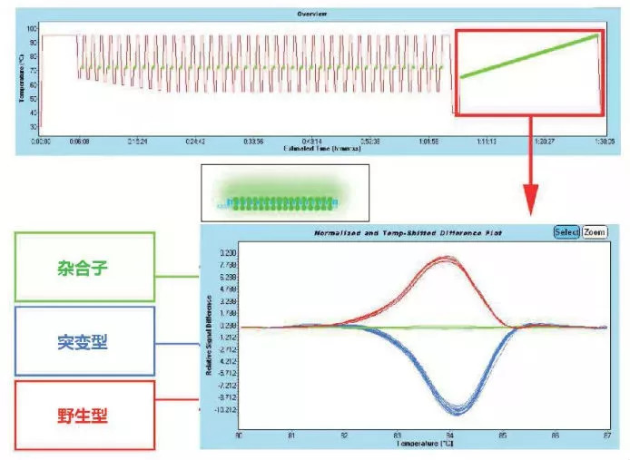 通过对仪器生成的高分辨率熔解数据进行归一化和温度平移处理,结合可由用户选择的差异显示图,可以非常客观地判断一批样本中不同的基因型的数量。