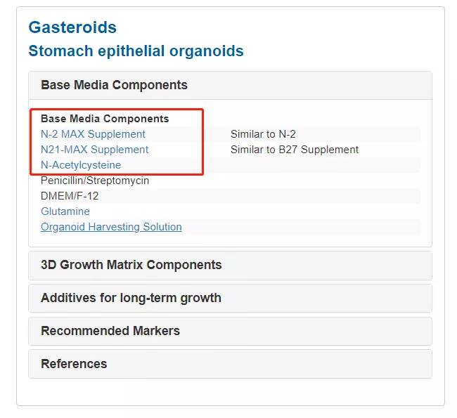 除此之外,N-2 MAX Media Supplement 和 N21-MAX Media Supplement 也可作为多种类器官实验的培养基补充剂。针对不同的类器官培养,在官网有配套的实验流程及配方可供参考(https://www.rndsystems.com/cn/products/organoid-and-3d-culture-reagents),如人胃类器官培养等: