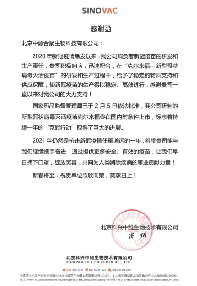中源公司在全球生物制品原辅料供不应求,国内进口产品短缺的情况下,积极协调各方力量帮助北京科兴生物解决供货问题,不遗余力地助力其新冠疫苗的早日研发及生产,得到北京科兴生物的特别感谢。