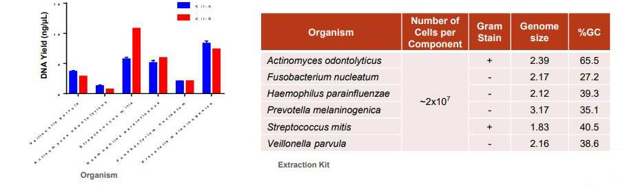ATCC通过使用两种商业化核酸提取试剂盒对口腔拭子标准品分别做提取实验(图2),与预期结果做对比以此来优化核酸提取方法。(口腔拭子基因组标准品ATCC® MSA-1004™和口腔拭子全菌株标准品ATCC® MSA-2004™,均为通过细胞计数等量分配菌株或经荧光定量后等量分配基因组拷贝数产品。)