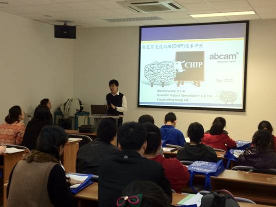2012年11月7日,中原公司携手Abcam在清华大学医学馆举办了一场新产品技术讲座。主题是染色质的免疫沉淀(ChIP)技术,由Abcam的科学技术专家——梁正晞博士来为大家讲解,现场坐无缺席。