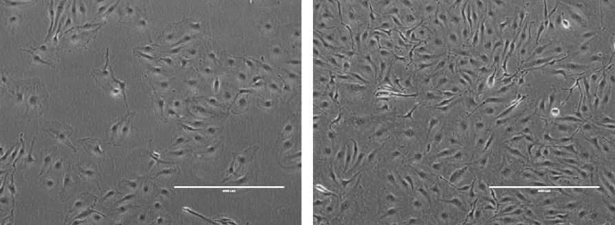 图1:HPAEC-BMI1的细胞形态。细胞在ATCC推荐的培养条件下培养。在显微镜下观察低(左)和高(右)密度的细胞形态,并用数码相机拍摄图像。倍增时间:约30小时