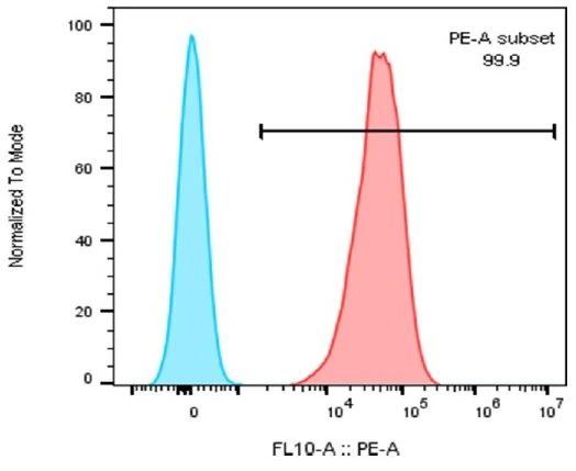 图2:HPAEC-BMI1细胞中CD31表达的流式细胞术分析。收获细胞并用PE小鼠抗人CD31抗体(红色直方图)或PE小鼠IgG1,κ同种型对照抗体(蓝色直方图)染色。在Beckman Coulter CytoFlex细胞仪上进行流式细胞术。