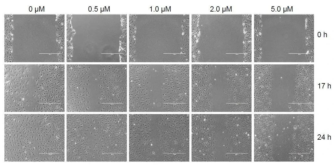 图5:舒尼替尼抑制HPAEC-BMI1细胞的迁移。细胞在12孔板中生长至完全融合,然后用无菌的1200μL移液管尖端将细胞层划伤。将含有0、0.5、1.0、2.0和5.0 μM舒尼替尼的培养基加入孔中。在透射光下使用EVOS荧光显微镜在0、17和24小时观察和拍摄孔间隙。